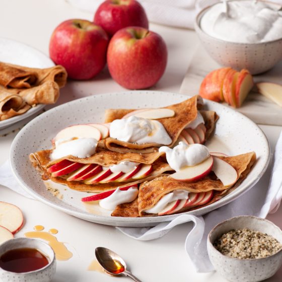 Thinly slice two Pink Lady® apples. Add the sliced apple to a frying pan with 1 tsp butter. Cook the apple until golden brown, around 2 minutes each side.