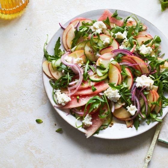 Once you are ready to serve, lightly toss through the rocket and mint and pile into a serving dish.